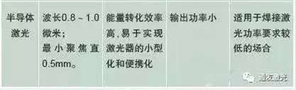 二、半導體激光焊接的光源在激光焊接工藝中,隨著半導體材料工業的快速發展,半導體激光作為光源也漸漸得到了應用。焊接的特點如表1所示: